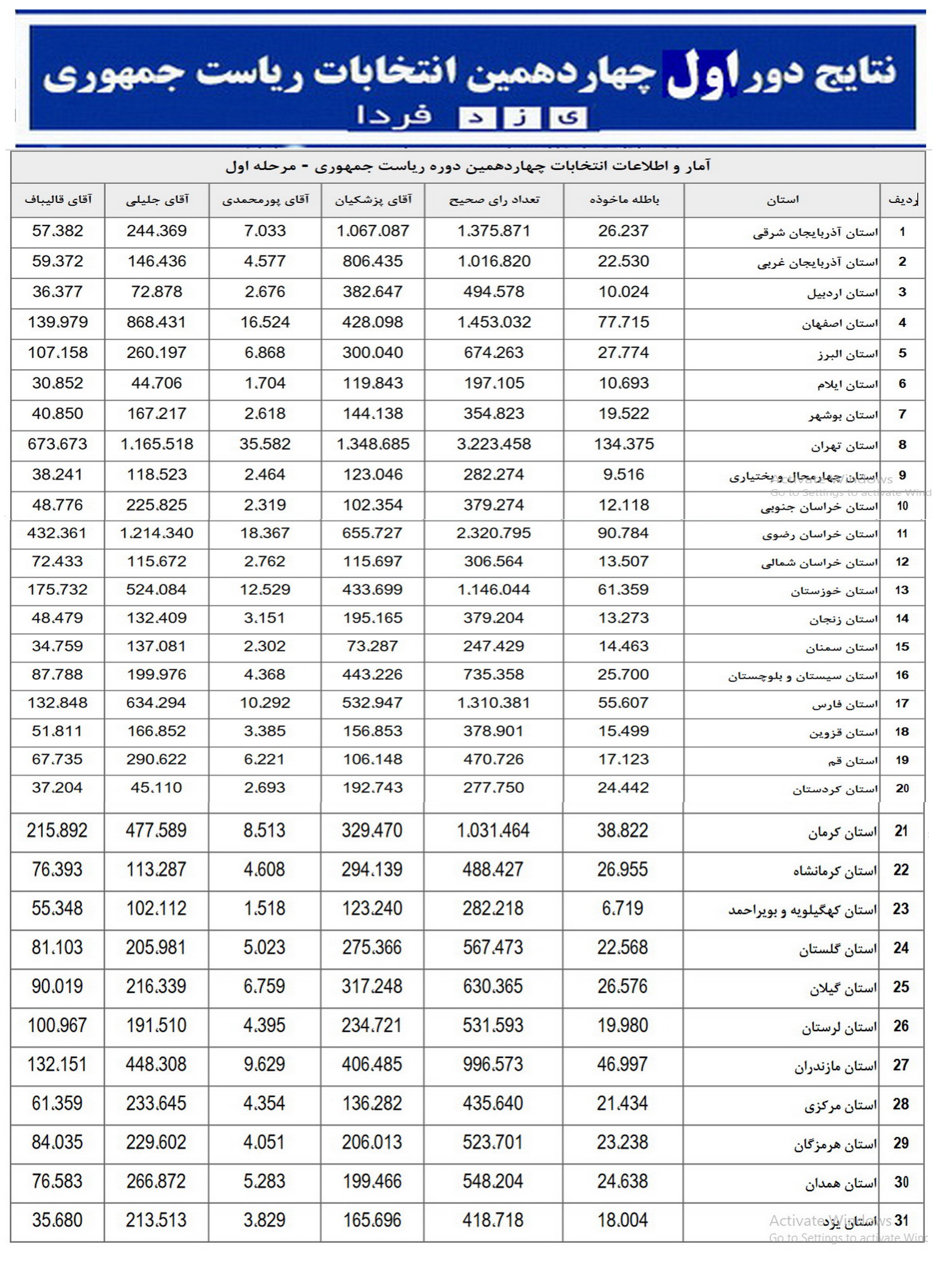 به گزارش یزدفردا: ستاد انتخابات کشور آمار و میزان آرای نامزدها به تفکیک استانهای سراسر کشور در مرحله دوم انتخابات چهاردهمین دوره ریاست جمهوری را اعلام کرد.