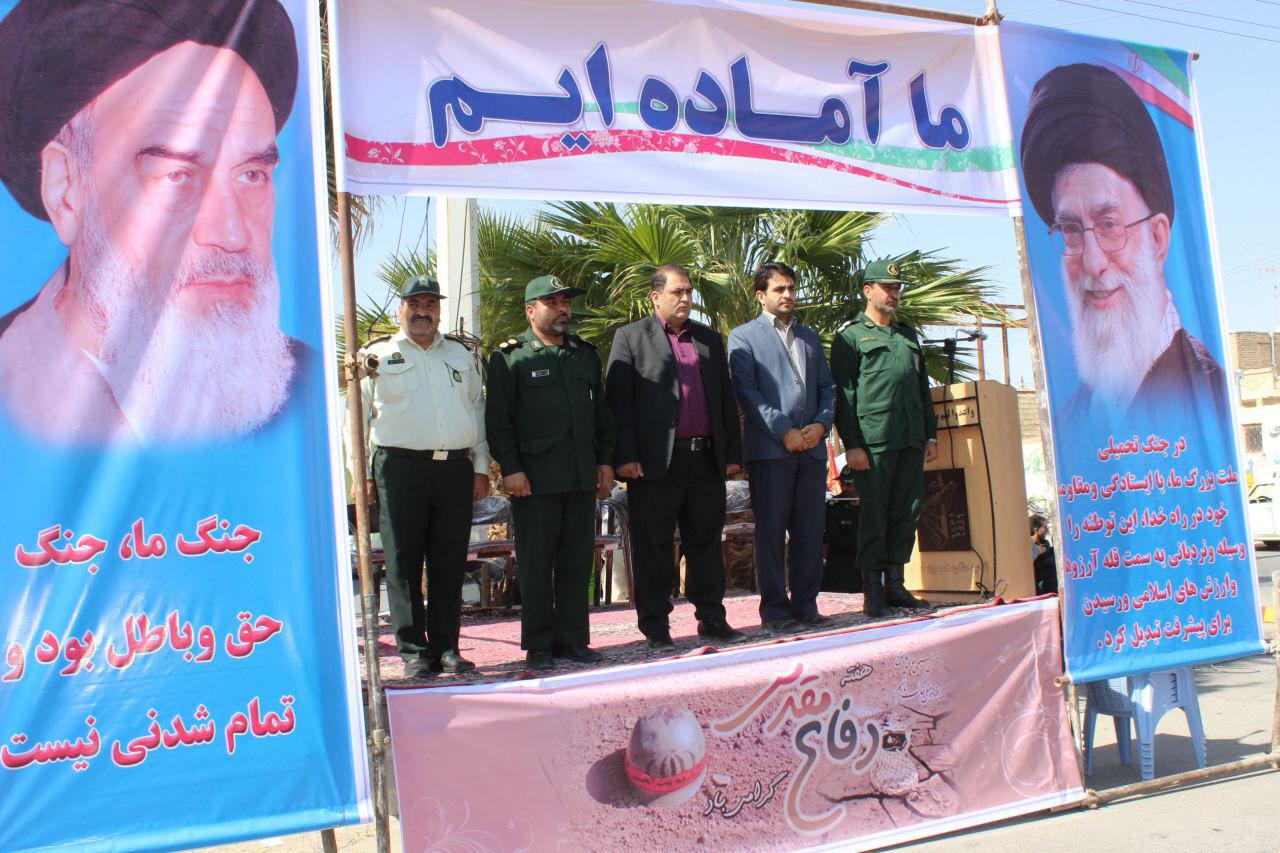 فرمانده ناحیه مقاومت بسیج خاتم نیز گفت: هشت سال دفاع مقدس حماسه بی بدیل و بی نظیر از جانفشانی های جوانان این مرز و بوم بوده است که با بصیرت الهی و با شعور سیاسی و تبعیت از ولایت فقیه توانستند به این پیروزی نائل شوند.