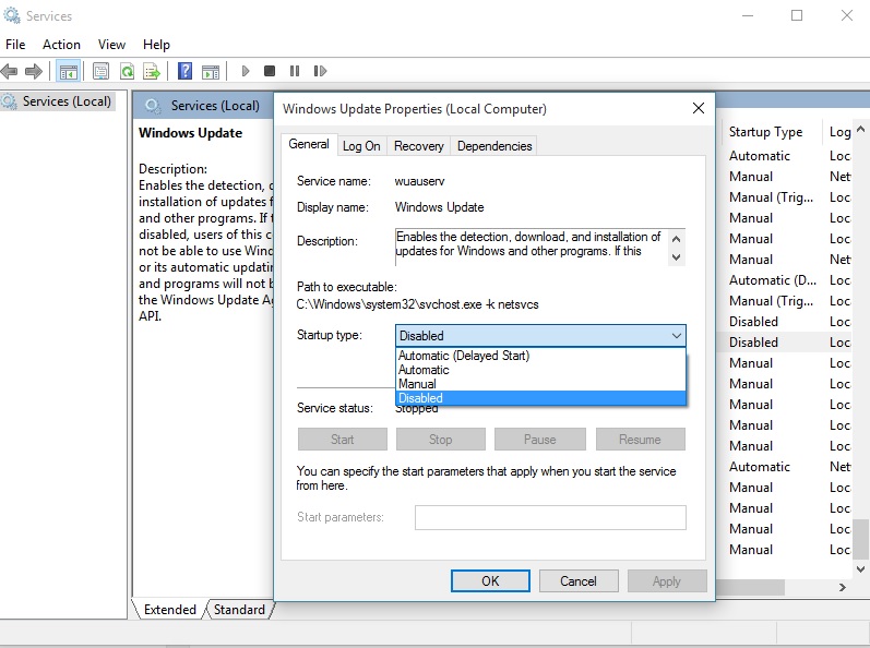 4- در این پنجره از قسمت Startup Type گزینه Disable را انتخاب کنید.