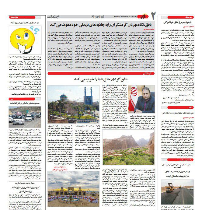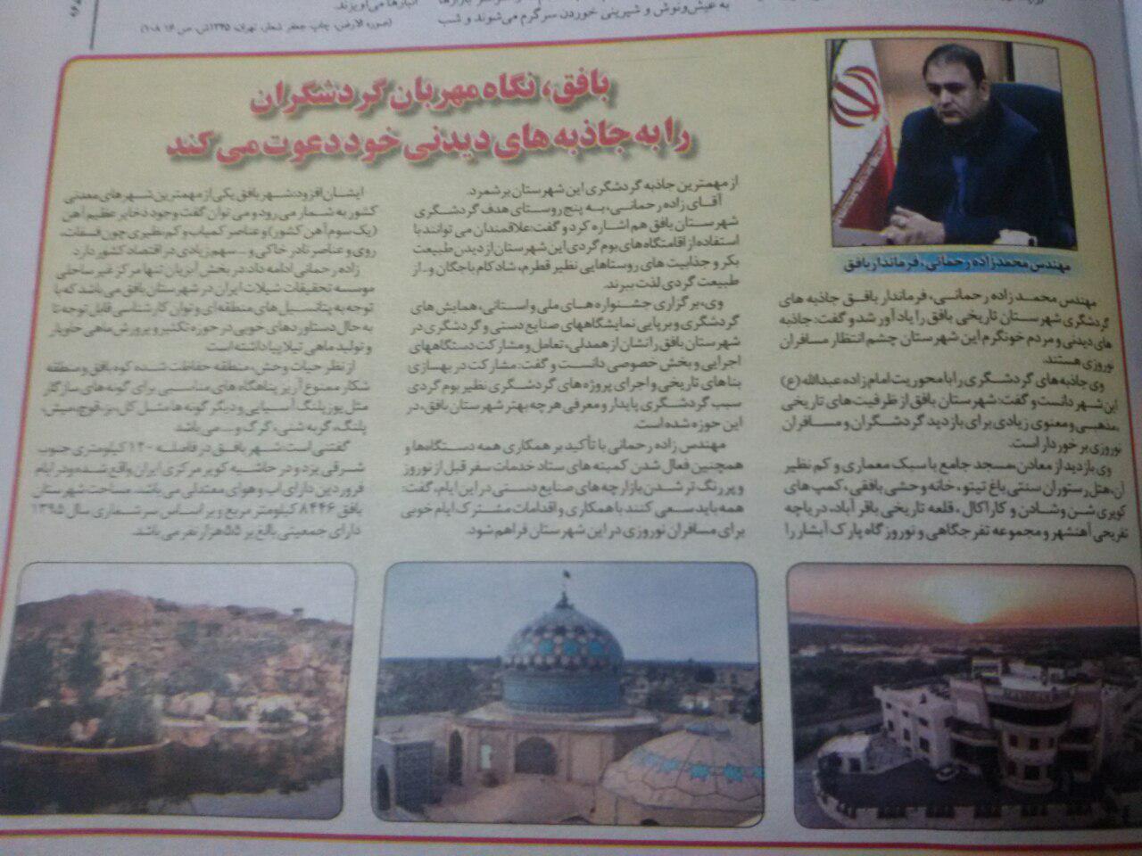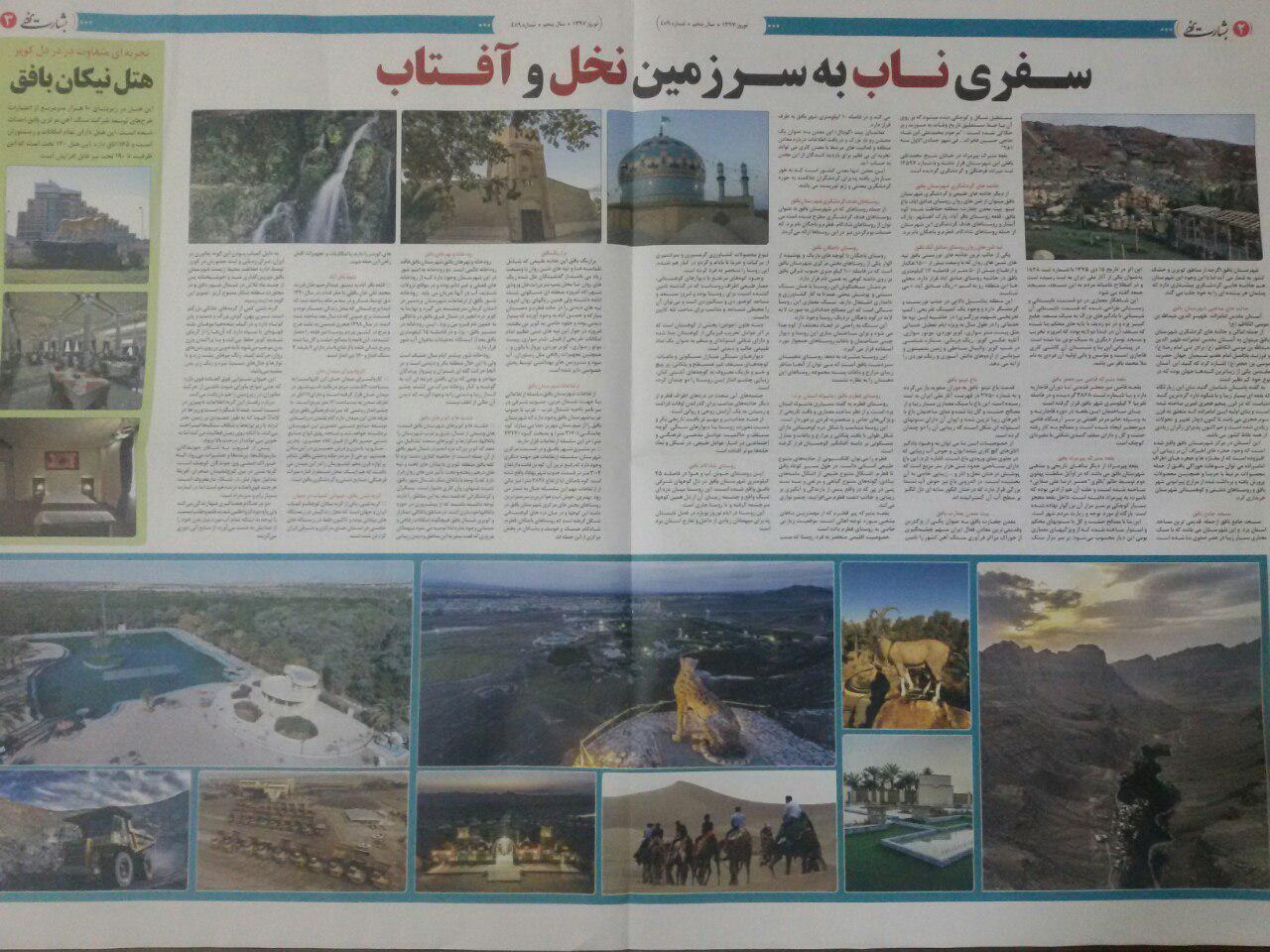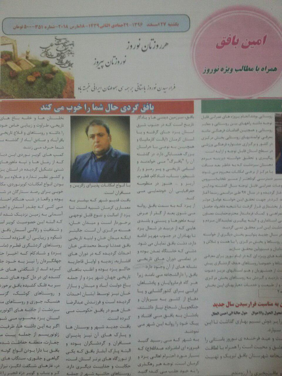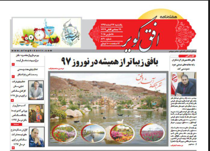 همزمان با آغاز سال جدید وشروع سفرهای نوروزی، روابط عمومی فرمانداری شهرستان بافق با همکاری نشریات استانی و محلی اقدام به چاپ ویژه نامه های گردشگری شهرستان و توزیع آن بین مسافرین نوروزی نموده است.
